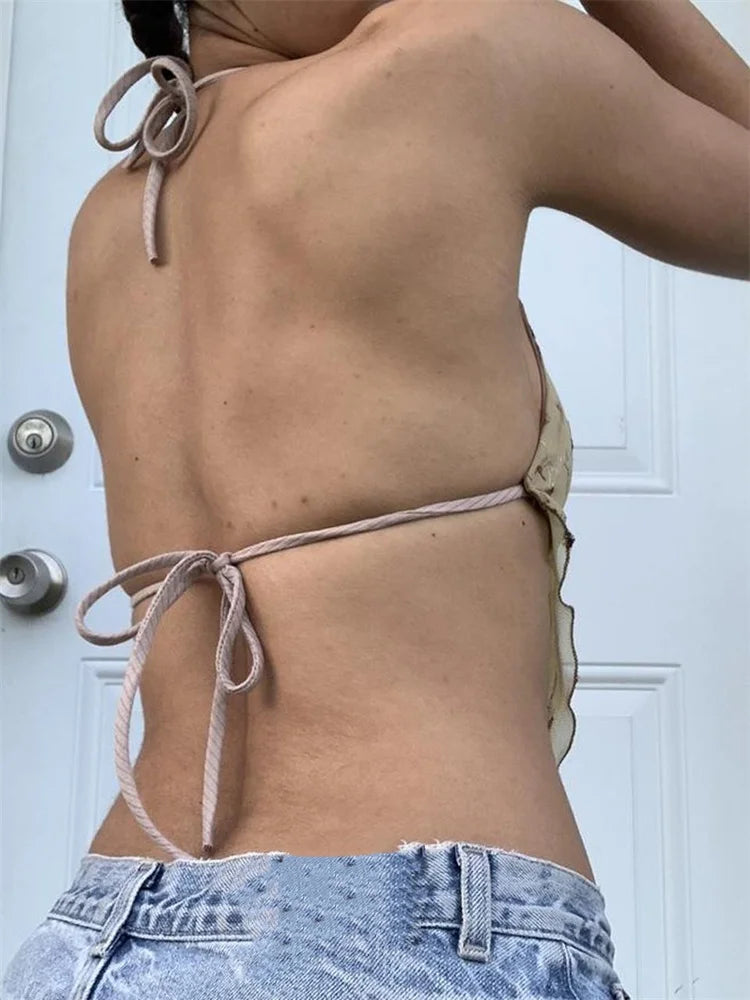 Y2K Backless Floral Retro Halter Tie Up Off Shoulder Summer Cute Mini Vest Streetwear Crop Top
