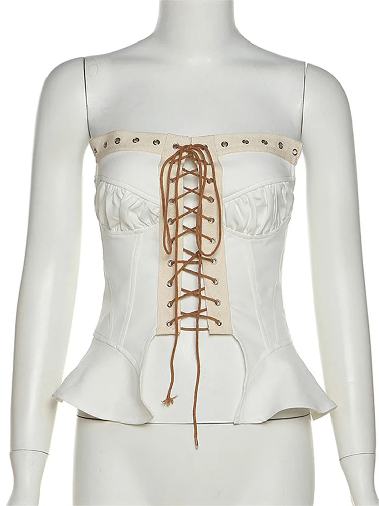 Y2K Strapless Off Shoulder Tube Cropped Summer Clubwear Front Hollow Out Criss-cross Tie-up for Vest Crop Top