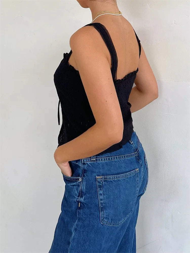 Y2K Floral Lace Mesh Ruffles Vests Sleeveless Low-Cut Tie-Up Vintage Summer Irregular Hem Tanks Crop Top