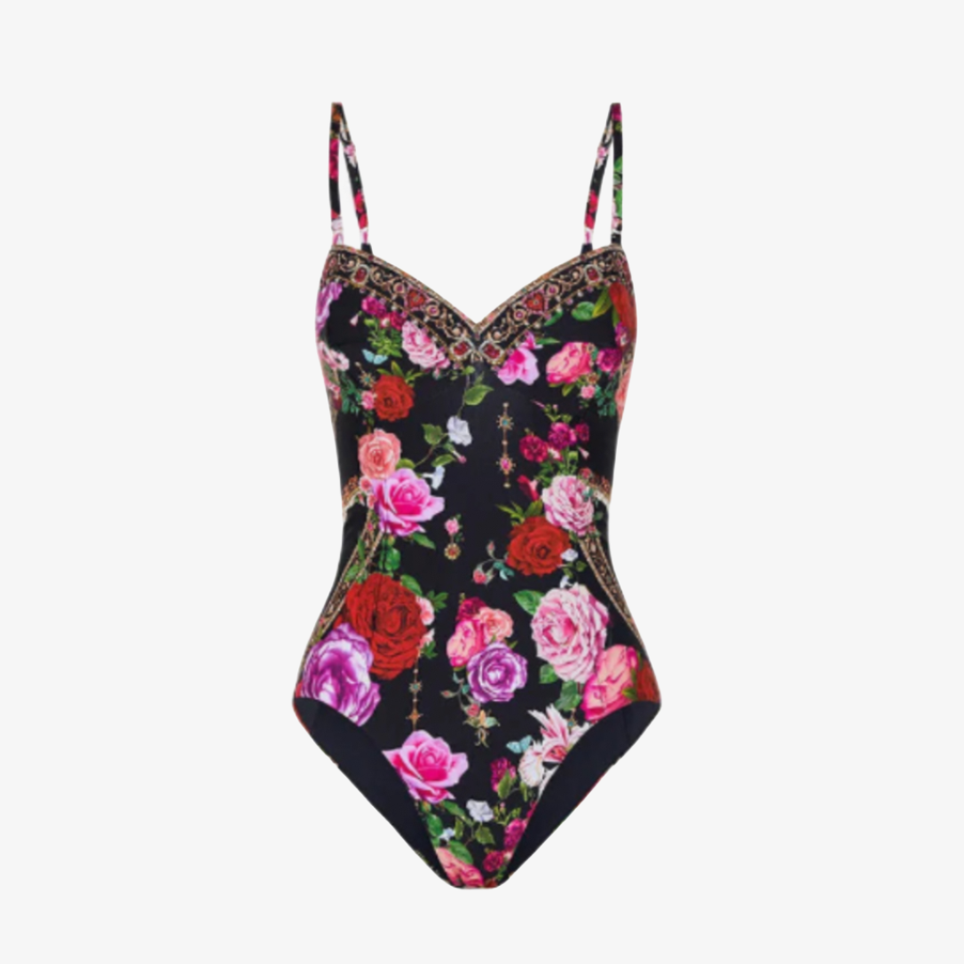 Steal the show this summer in our Yael Vintage Dark Floral One-Piece Swimsuit. With a daring dark floral print. this suit is sure to turn heads. Stay comfortable and stylish with the perfect blend of vintage and modern. Dive in with confidence!