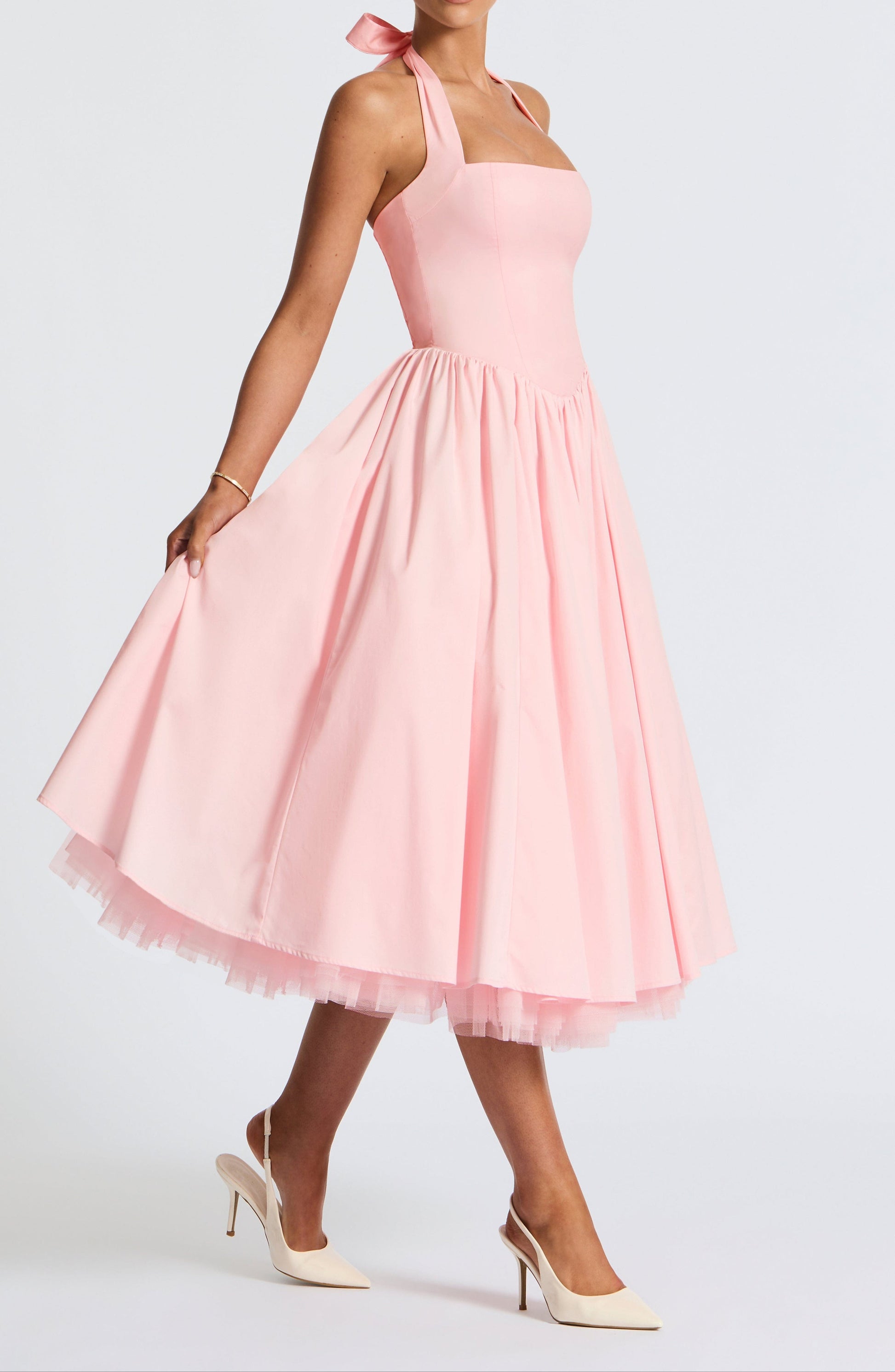 Elegant Princess-Worthy Midi Dress �The Cressida Midi Dress in soft blush is crafted from luxe cotton-nylon-elastane voile for structured sophistication. Featuring a square halter neckline and full skirt gathered at the waist. this fully lined dress combines timeless elegance with internal tulle for subtle. royal-worthy volume.